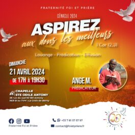 Rdv ce dimanche 21 avril pour le 3ème dimanche du cénacle avec comme thème « ASPIREZ aux dons les meilleurs » 1Cor 12,31 Chapelle Ste Odile Antony à 17h.